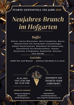 Mit einem festlichen Neujahres-Brunch lädt das Restaurant Hofgarten am 1. Januar 2026 zum genussvollen Start in das neue Jahr ein. Von 12:00 bis 14:30 Uhr erwartet die Gäste ein reichhaltiges Buffet mit herzhaften und frischen Spezialitäten – begleitet von stilvollem Ambiente und entspannter Atmosphäre.